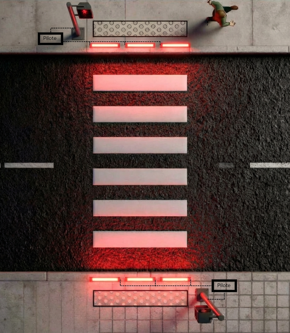 COLOROAD est un dispositif lumineux implanté au sol, sur le trottoir, en amont immédiat du passage piéton. Sa vocation est de transposer visuellement l’état du feu tricolore directement dans l’axe de regard du piéton, notamment celui absorbé par son smartphone. C’est une couche d’information complémentaire, instinctive, lisible, positionnée exactement là où le piéton pose les yeux.