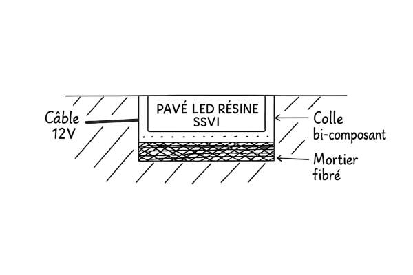 À l’inverse, la résine SSVI épouse la dynamique du revêtement, garantissant une intégration durable et parfaitement affleurante, tout en offrant une translucidité qui permet d’y intégrer des LED rouges, vertes, blanches ou orange pour une signalisation réactive et expressive.